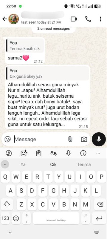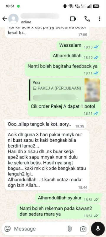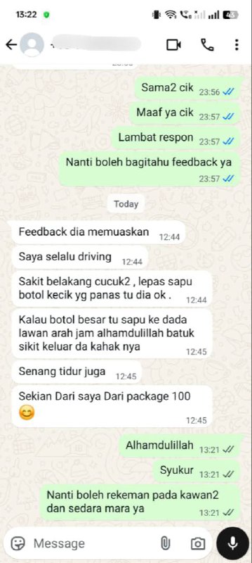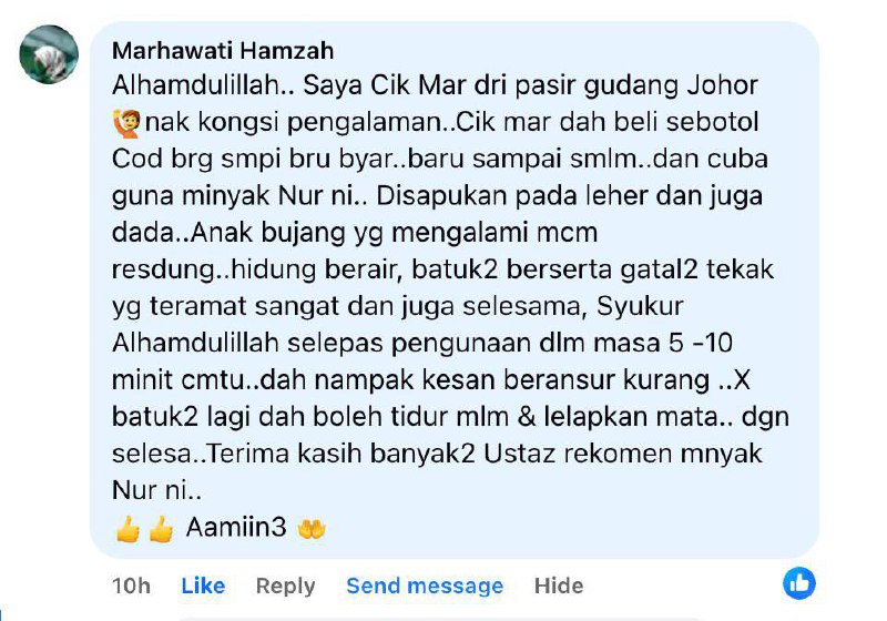 “Semalam saya bagi pada mak saya, lepas dia pakai dia kata betul-betul rasa lega. Sengal-sengal badan hilang.”